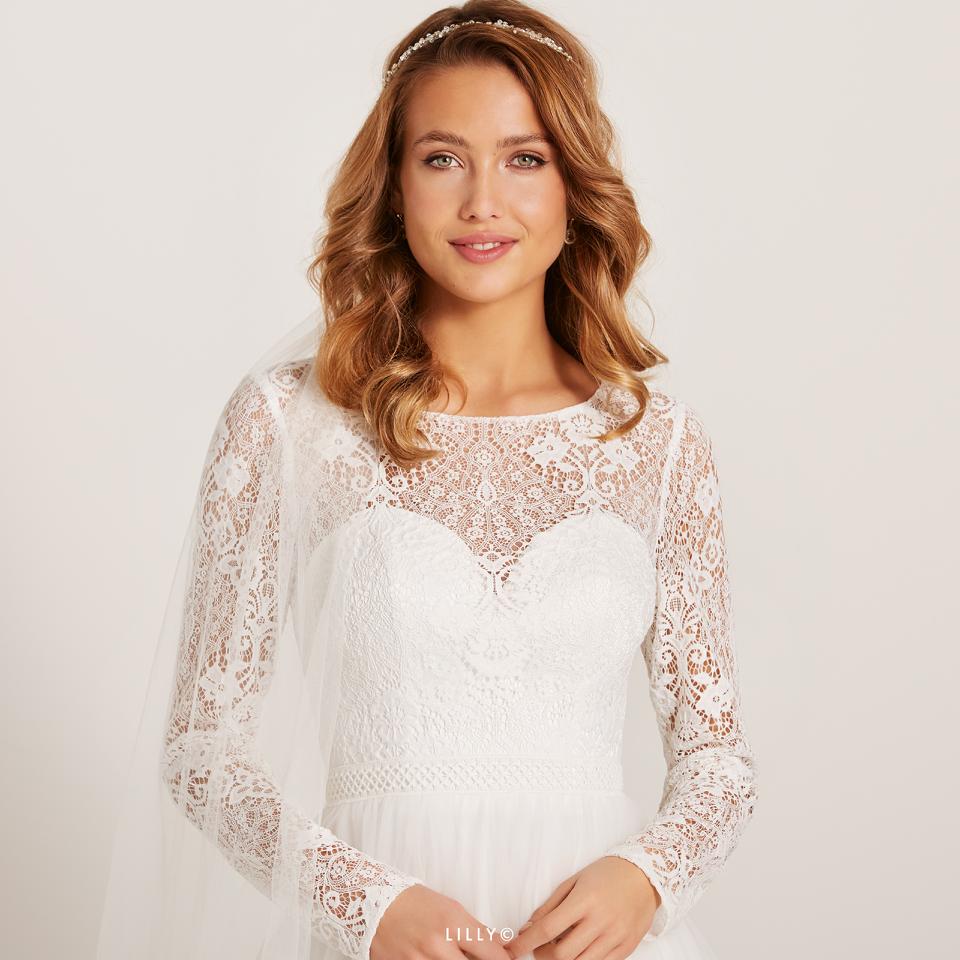 Lange semi-gennemsigtige ærmer i florlet georgette eller detaljerig blonde giver et ultra-elegant udtryk og rum til yderligere broderede finesser.