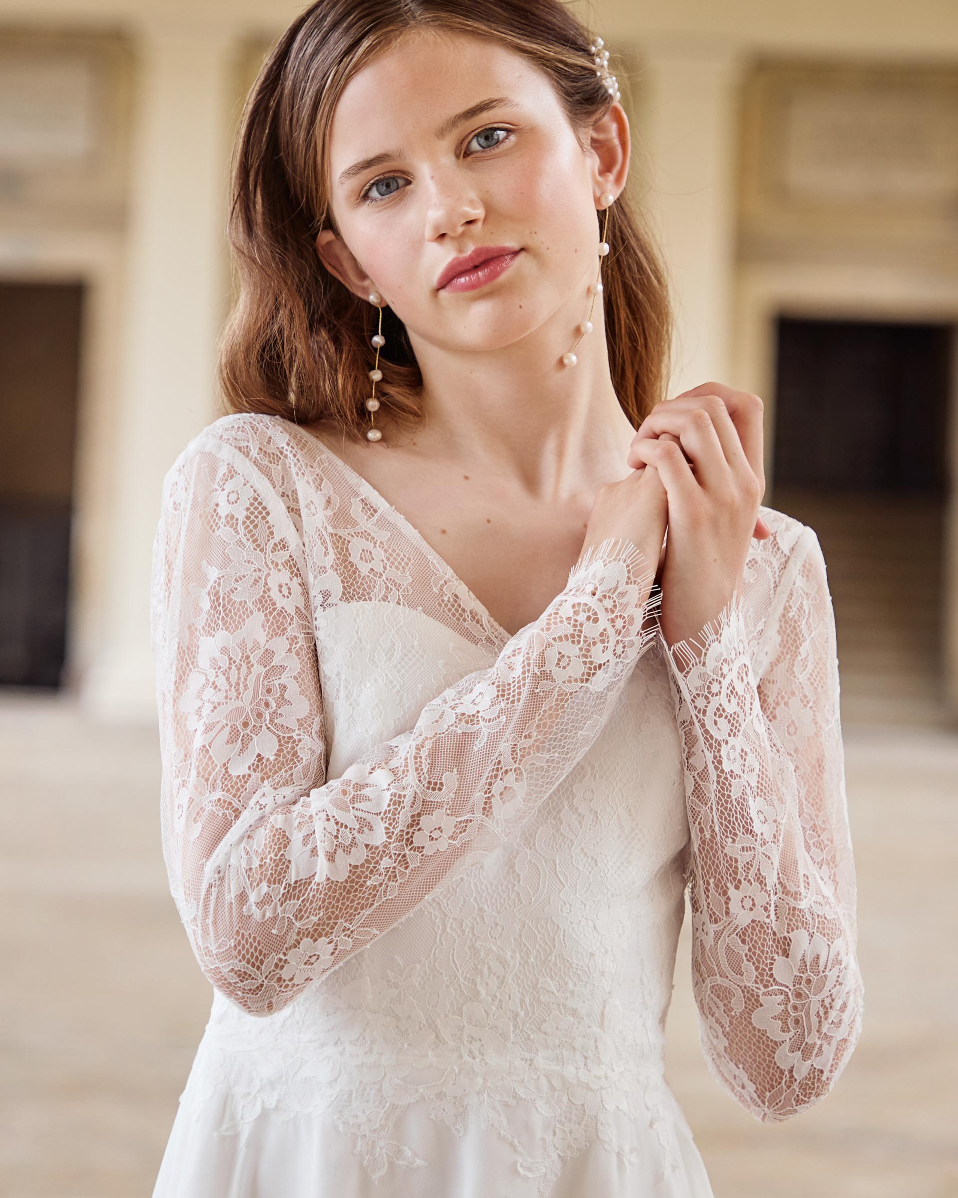 Åres konfirmationskjole favorit er den smukke konfirmation kjole med klassisk A-line nederdel og blonde overdel med V-hals og lange smalle ærmer.