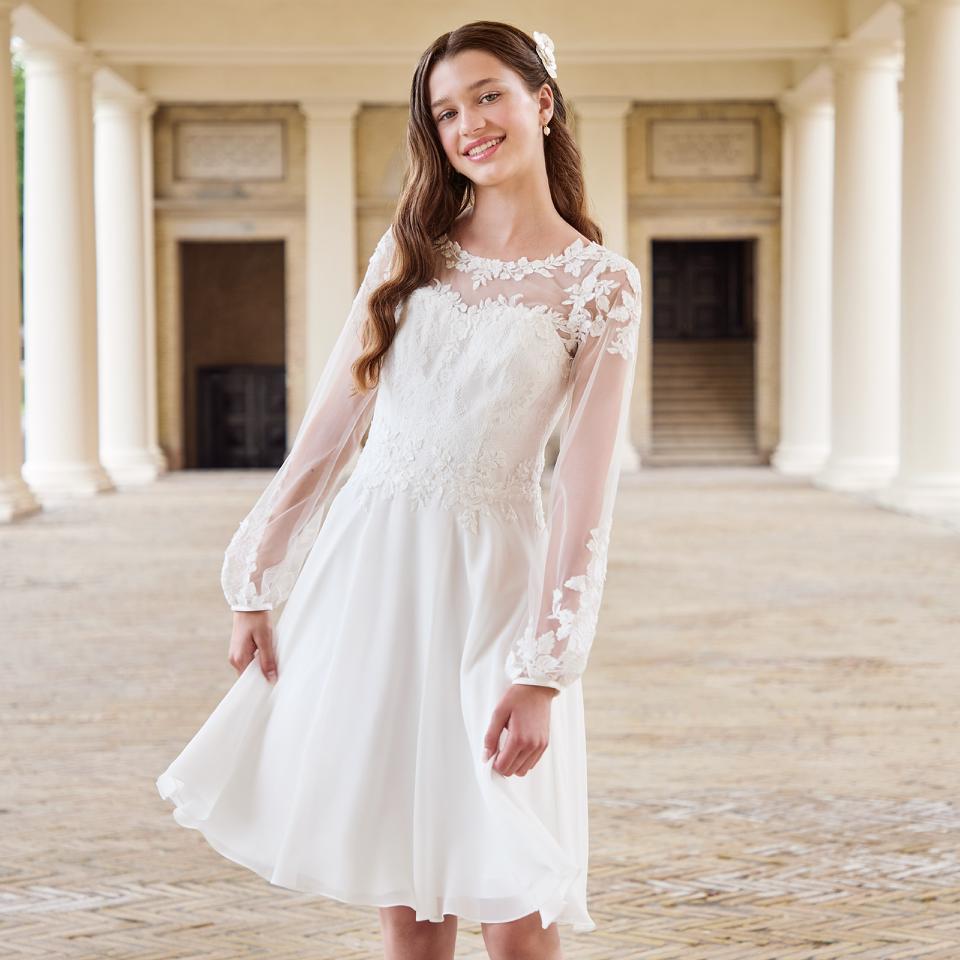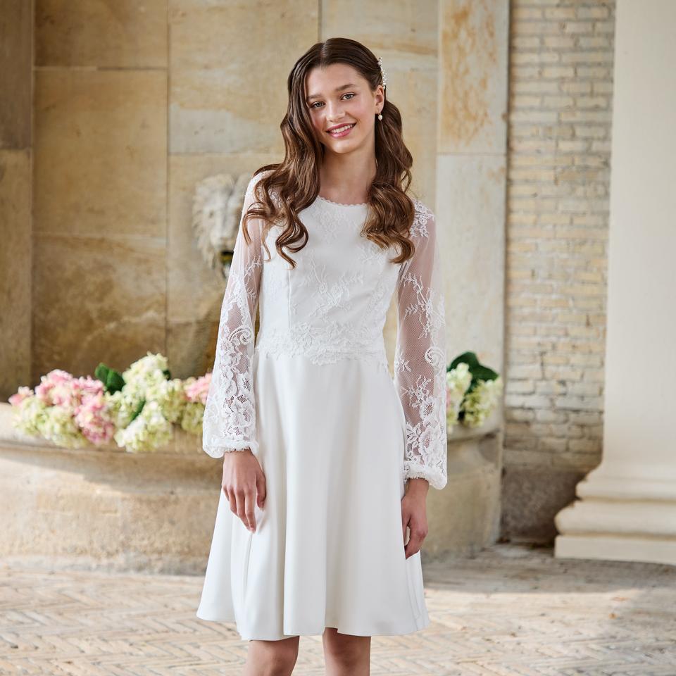 Smuk og stilren konfirmationskjole med lange blonde ærmer og klassisk rund hals udskæring. Nederdelen går til omkring knæet og har masser af vidde i den bløde, klassiske A-facon.